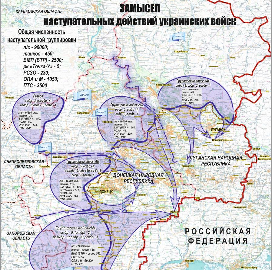 In Richtung Lugansk verfolgen die Streitkräfte der Ukraine einen Plan separater Kampfhandlungen mit den dortigen Einheiten der Volksmiliz der Volksrepublik Lugansk, um deren Verlegung zwecks Unterstützung der Volksrepublik Donezk zu verhindern und sie vor Ort auf dem Territorium der Volksrepublik Lugansk zu binden. Die ukrainischen Truppen werden dort offensiv eingesetzt werden, um die Grenze nach Russland zu erreichen.