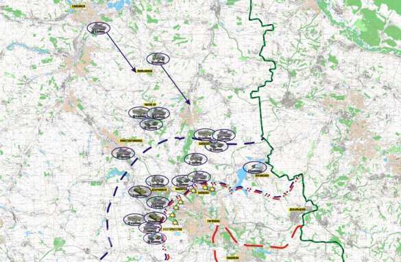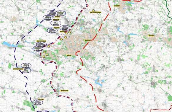„In Stossrichtung Gorlowka gibt es folgende Angriffspunkte: Tschassow Jar – 13 Panzereinheiten sowie Schützenpanzer und Schützenpanzerwagen. Saizewo/Artjomowsk – bis zu 50 Einheiten an Panzern, Schützenpanzern und Schützenpanzerwagen. Konstantinowka – 12 Hubschrauber Mi-8. Luganskoje – 4 D-30 Geschütze. Dserschinsk – 5 Panzer, 2 BM-21, „Grad“-Systeme und zwei mobile Artilleriebatterien „Akazia“. Majorsk – 2 Panzer und 6 Schützenpanzer. Nowgorod – 3 SAU, 15 Panzer, 16 Schützenpanzer und 13 Schützenpanzerwagen.“