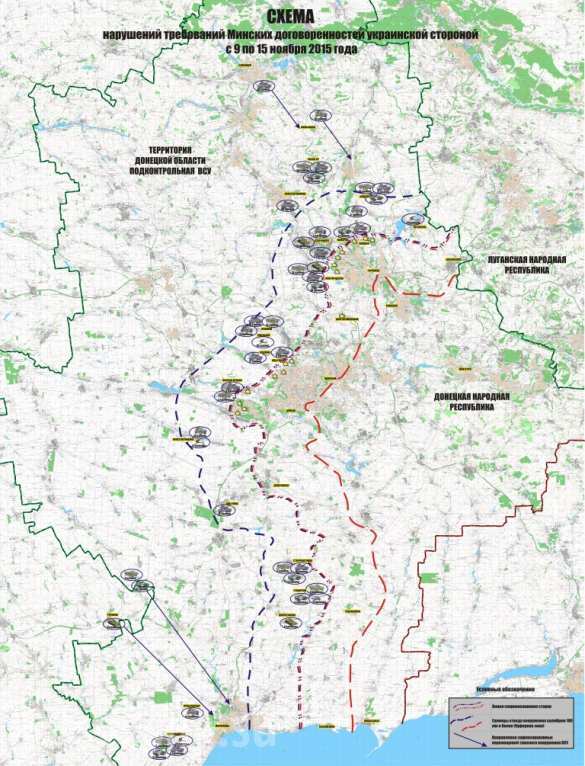 Die Streitkräfte der Ukraine haben mehr als 300 Einheiten Kampftechnik an die Donbass-Front verlegt. Darunter sind 173 Einheiten Kampftechnik, welche die Vereinbarung von „Minsk-2“ laut Verteidigungsministerium der Volksrepublik Donezk untersagt hat (siehe Karte).